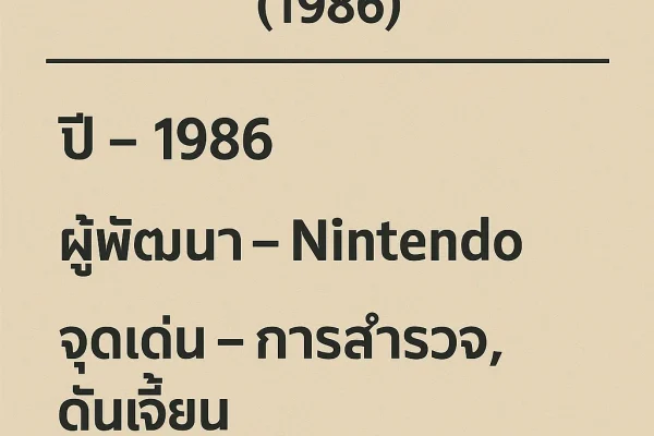 The Legend of Zelda (1986) สรุปข้อมูลสำคัญ (ปี – ผู้พัฒนา – จุดเด่น – อิทธิพล) บทนำ: การกำเนิดตำนานที่เปลี่ยนโลกเกม ปี 1986 คือปีที่วงการวิดีโอเกมได้ต้อนรับการถือกำเนิดของหนึ่งในซีรีส์เกมที่ยิ่งใหญ่ที่สุดตลอดกาล นั่นคือ The Legend of Zelda เกมที่ผสมผสานแนวแอ็กชัน การผจญภัย และการแก้ปริศนาเข้าไว้ด้วยกันอย่างลงตัว เกมนี้ไม่ได้เป็นเพียงแค่เกมธรรมดา แต่เป็นจุดเริ่มต้นของ “ตำนาน” ที่ยังคงดำเนินมาจนถึงปัจจุบัน และยังเป็นแรงบันดาลใจให้เกมอีกหลายพันเกมที่เกิดขึ้นตามมา 1. ปีที่เปิดตัว: 1986 จุดเปลี่ยนครั้งใหญ่ การเปิดตัวของ Zelda ในปี 1986 เปรียบเสมือนการปักธงประกาศว่า วงการเกมกำลังก้าวเข้าสู่ยุคใหม่ 2. ผู้พัฒนา: ทีมงานในตำนาน The